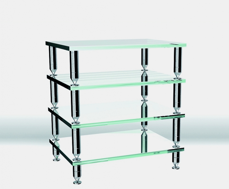 ist eine Verbindung aus mehreren Schichten Glas. Diese Glas wurde durch innovative Materialverbindung speziell für den Bereich High End entwickelt. Die Transparenz des Glases wird hierdurch nicht beeinträchtigt. Schallwellen und Schwingungen die durch den Raum und über den direkten Kontakt von Geräten (Gerätefüße) auf das Soundglas wirken, werden durch die Schichten absorbiert. Während der Absorption (dissipatives Prinzip) werden die Schwingungen in dem Polymer in Wärme umgewandelt. Nach intensiven Testreihen mit immer wieder unterschiedlichen Mixturen und kritischen Testpersonen haben uns jetzt die ersten Präsentationen bestätigt, ein Bauteil entwickelt zu haben, dessen Unterschied jeden High-fidelity Hörer begeistern wird. Dadurch bieten sich neuartige gestalterische Möglichkeiten, designorientierte, wohnliche Möbel und Klang zu kombinieren, was momentan nur technische Racks erfüllen können.