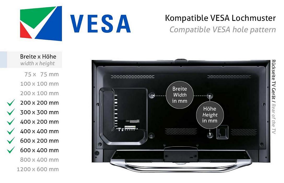- für VESA-Befestigungen von 200 x 200 bis 600 x 400 mm