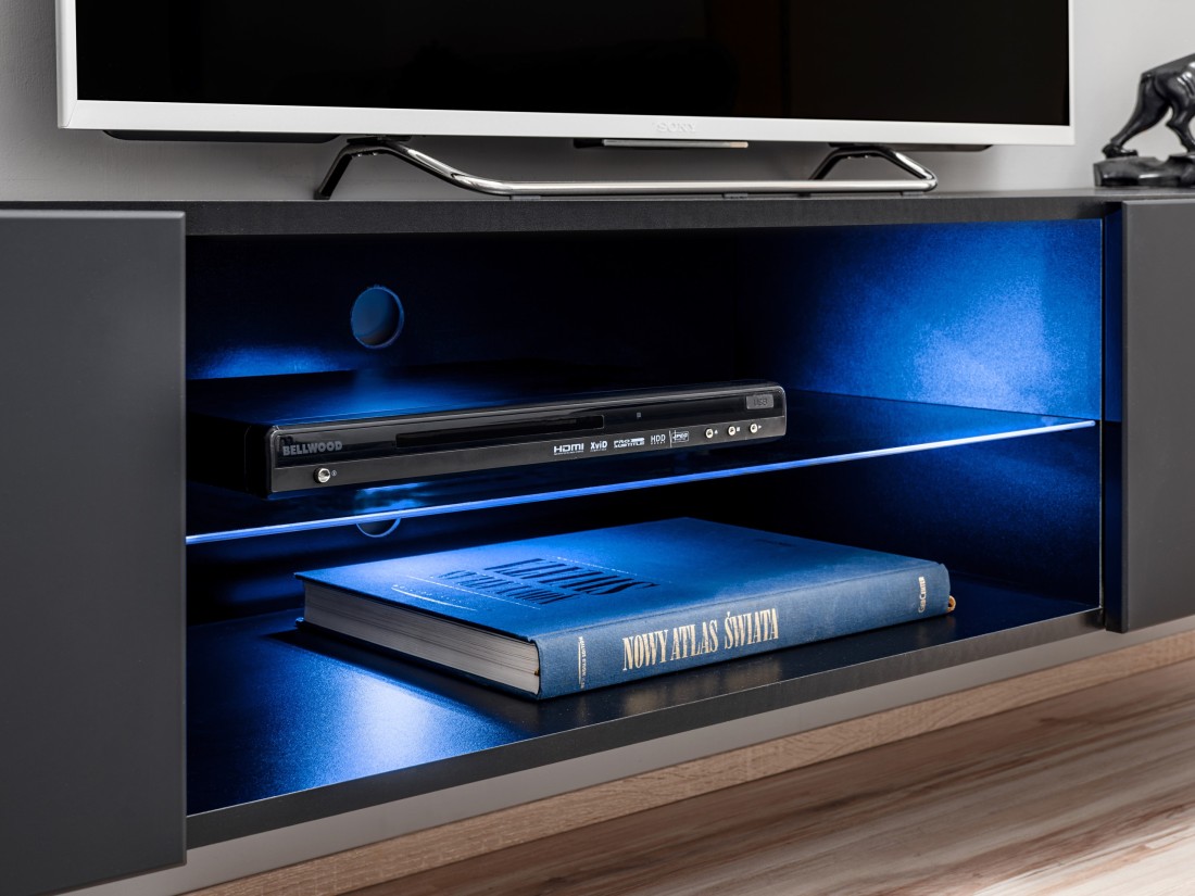 • 1x Tv - Tisch: mit zwei Klappen, innen je ein offenes Fach, in der mitte ein offenes Fach mit einer Led beleuchteten Glasablage. Klappenhalter enthalten.